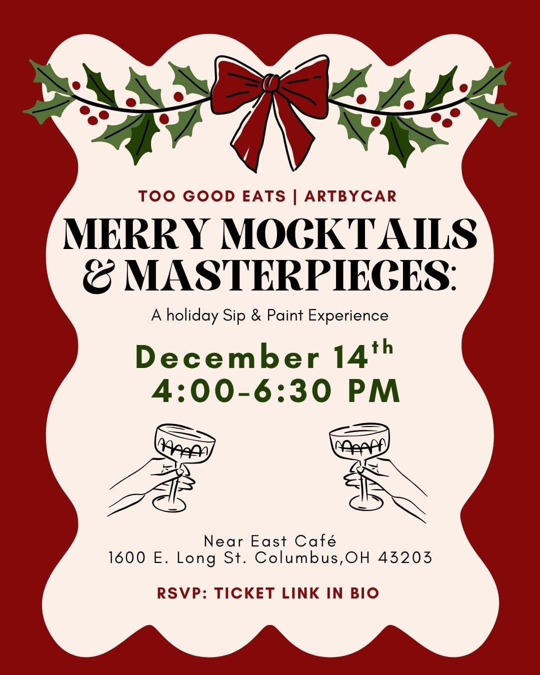 Join us for Merry Mocktails & Masterpieces, a holiday sip and paint experience at Near East Café. Enjoy handcrafted mocktails curated by Too Good Eats, a live DJ, heavy charcuterie, and a festive painting session led by Art by Car. No experience needed.
